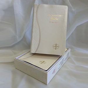 A standard New American Bible St. Joseph Edition that comes with the wedding symbol and lace cover finished with gold-trimmed pages.