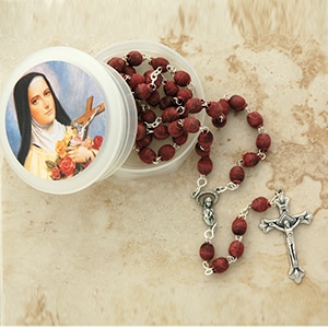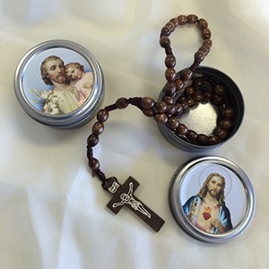 A dark wooden Rosary corded that comes in varying tin cases with a small prayer on the back.