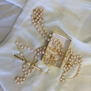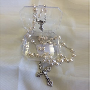 A pearl heart rosary with chalice center pendant for a little girl’s first holy communion.