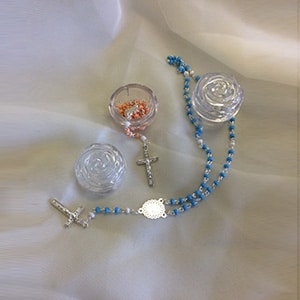 A small 3mm rosary that come in a jeweled rose case, available in an assortment of colors.