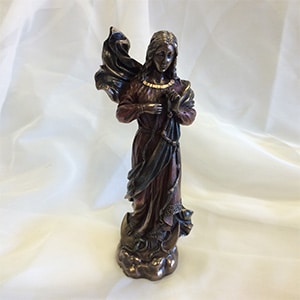 An 8″ cold cast bronze statue depicting Our Lady Untier of Knots.