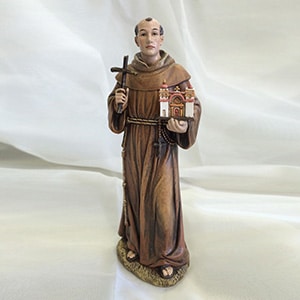 An 8″ statue of St. Junipero: the Patron Saint of Vocations. He founded 21 missions and converted thousands of Indians. The converts were taught sounds methods of agriculture, cattle raising, and arts & crafts.