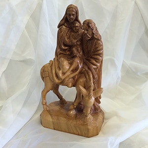 Coming from Jerusalem and made out of native Olive Wood from the region, this statue depicts Jesus, Mary, and Joseph’s flight into Egypt. Stands at 11″ tall.